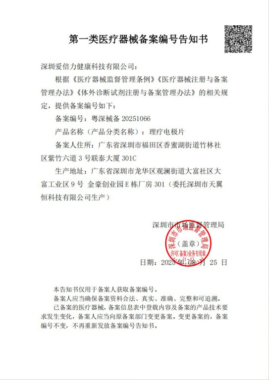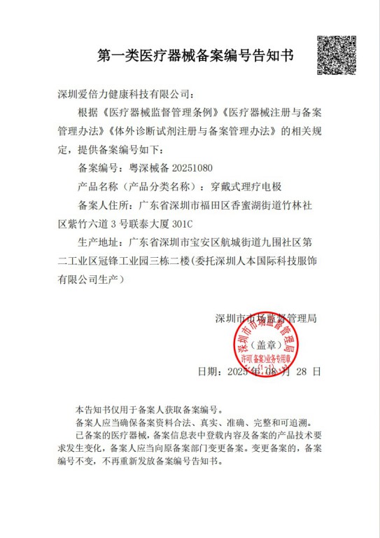 第一类医疗器械备案证-穿戴式理疗电极(全品类)